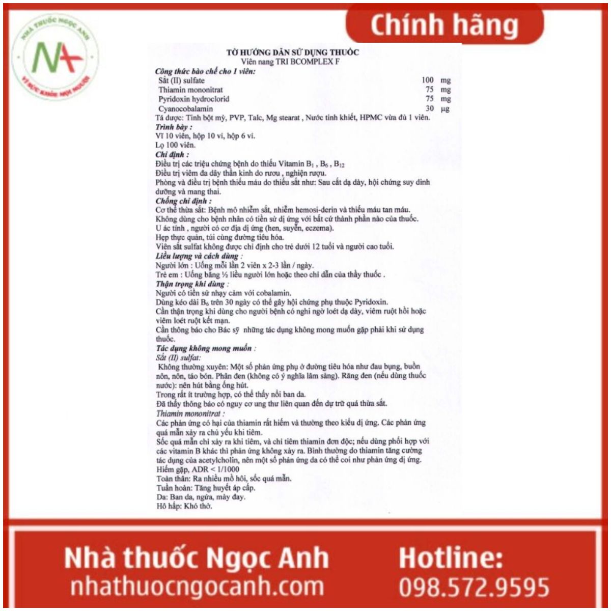 Thuốc Tribcomplex F bán ở đâu chính hãng và uy tín nhất? Bạn đọc không cần mang theo đơn mà bác sĩ có kê thuốc Tribcomplex F đã có thể mua thuốc Tribcomplex F chính hãng trực tiếp tại nhà thuốc Ngọc Anh hoặc liên hệ qua số hotline hoặc nhắn tin trên website để được tư vấn sử dụng thuốc Tribcomplex F đúng cách. Nhà thuốc hỗ trợ giao hàng toàn quốc.
