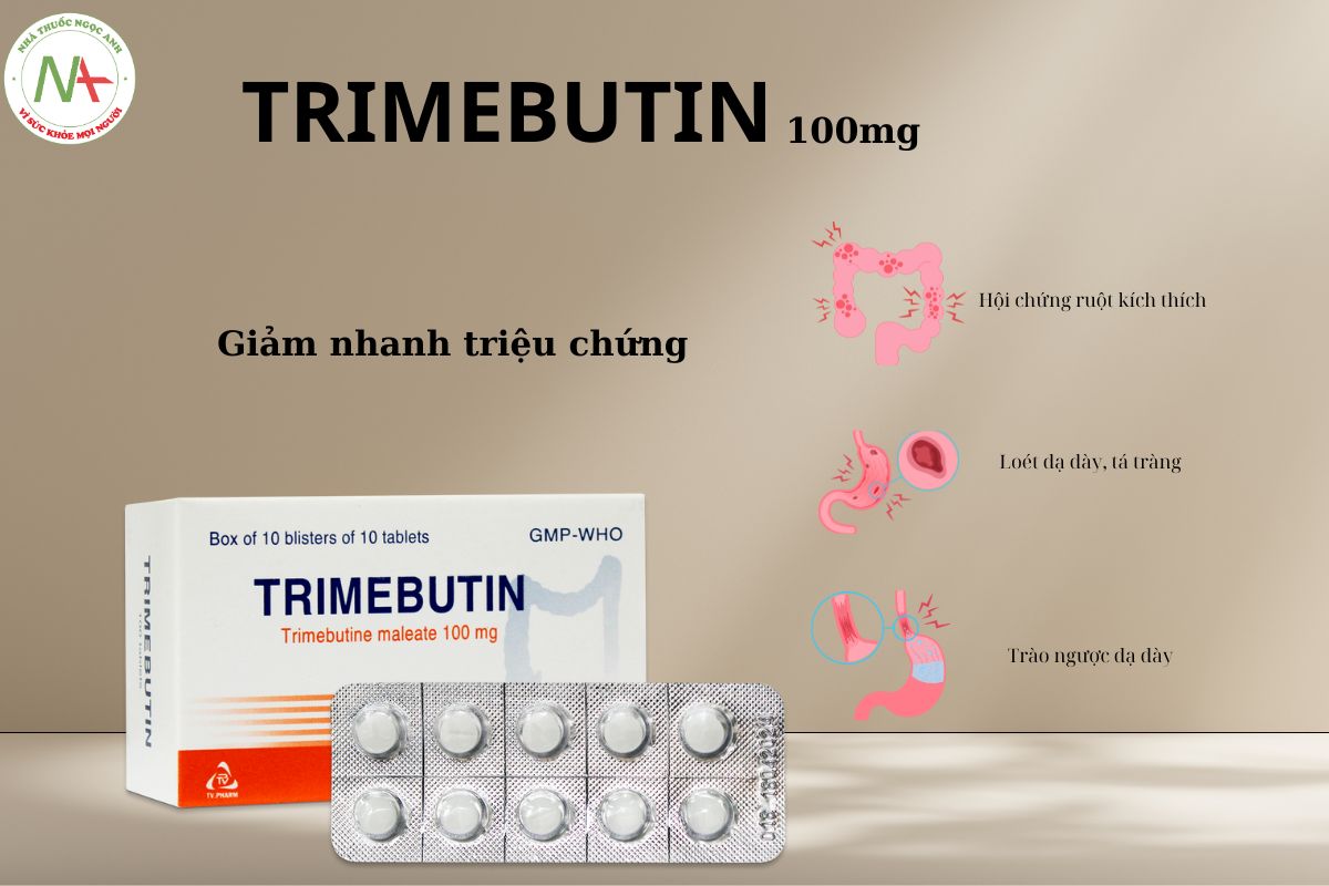 Thuốc có tác dụng điều hòa nhu động tiêu hóa, có thể kích thích hoặc ức chế tùy theo trạng thái của đường ruột. Trimebutin giúp giảm co thắt dạ dày-ruột, hỗ trợ điều trị hội chứng ruột kích thích, chứng khó tiêu và bệnh chi nang đại tràng.