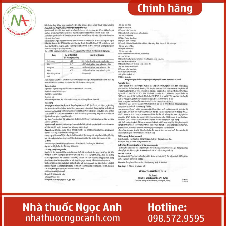 - Dược chất chính Piracetam 800 mg.