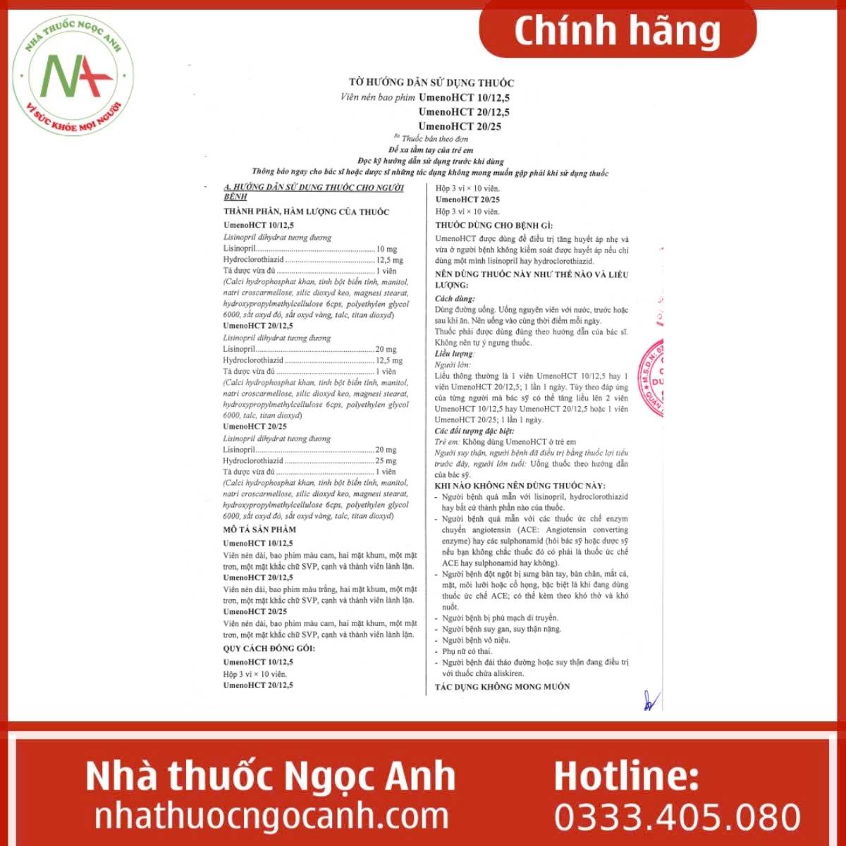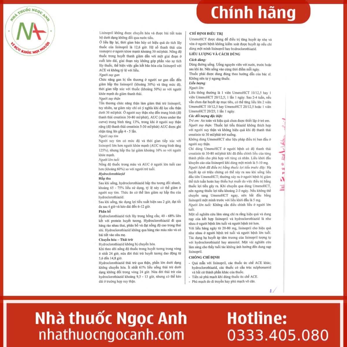 Thuốc UmenoHCT 20/12,5 là một loại thuốc kết hợp chứa 20mg Lisinopril và 12,5mg Hydrochlorothiazide. Đây là một loại thuốc thường được sử dụng để điều trị tăng huyết áp ở người lớn, với liều dùng thông thường là một viên mỗi ngày.