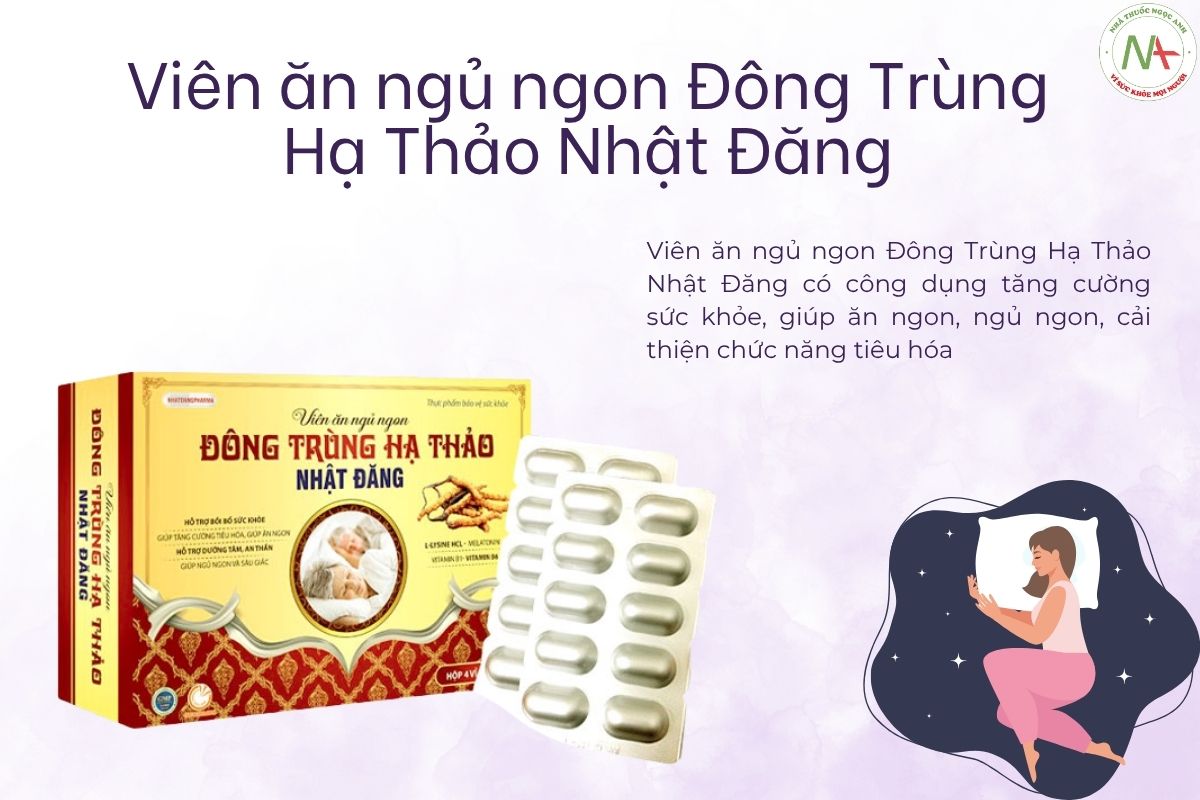 Viên ăn ngủ ngon Đông Trùng Hạ Thảo Nhật Đăng có công dụng tăng cường sức khỏe, giúp ăn ngon, ngủ ngon, cải thiện chức năng tiêu hóa.