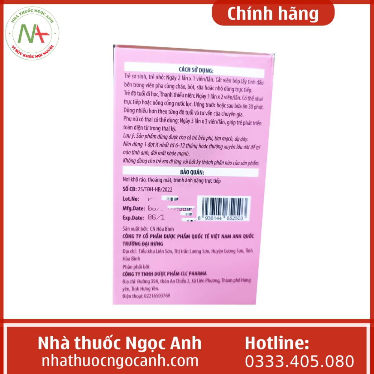 - Nhà sản xuất: Công ty CP dược phẩm quốc tế Việt Nam Anh Quốc trường Đại Hưng