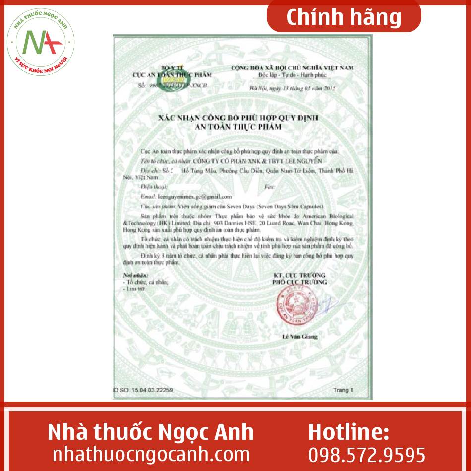- Viên uống giảm cân Seven Days đã được nghiên cứu chứng minh an toàn cho người dùng, đạt tiêu chuẩn GMP-WHO, ISO, và được Bộ Y tế cấp giấy phép lưu hành toàn quốc.
