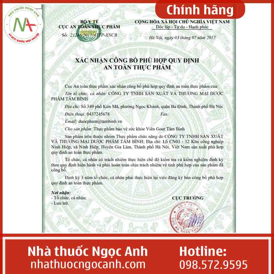 Viên Gout Tâm Bình là một sản phẩm của Công ty TNHH Thương mại Dược phẩm Tâm Bình, thuộc nhóm sản phẩm hỗ trợ điều trị bệnh Gout.