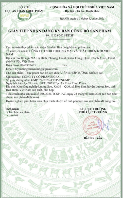 - Sản phẩm đạt chuẩn GMP, được Bộ Y tế chứng nhận đạt tiêu chuẩn vệ sinh an toàn thực phẩm và cấp phép lưu hành rộng rãi trên toàn quốc.