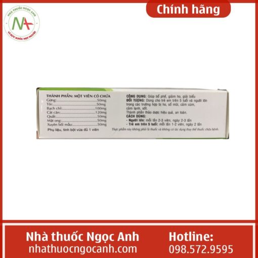 Đây là thực phẩm chức năng, không phải thuốc nên không có tác dụng thay thế thuốc trong điều trị. Sản phẩm chỉ có vai trò hỗ trợ trong điều trị tình trạng ho, ho khan, ho có đờm, cảm cúm, chảy nước mũi…