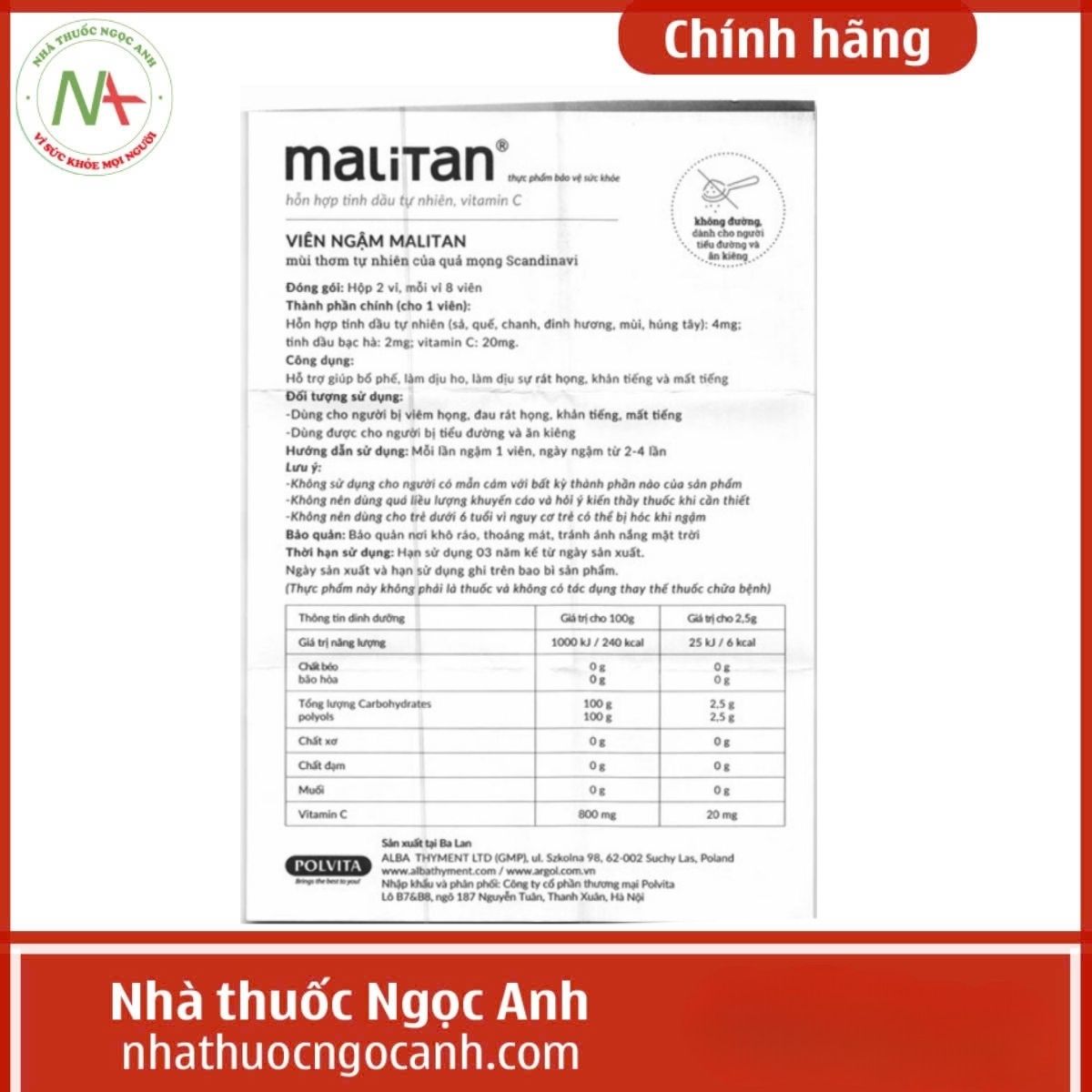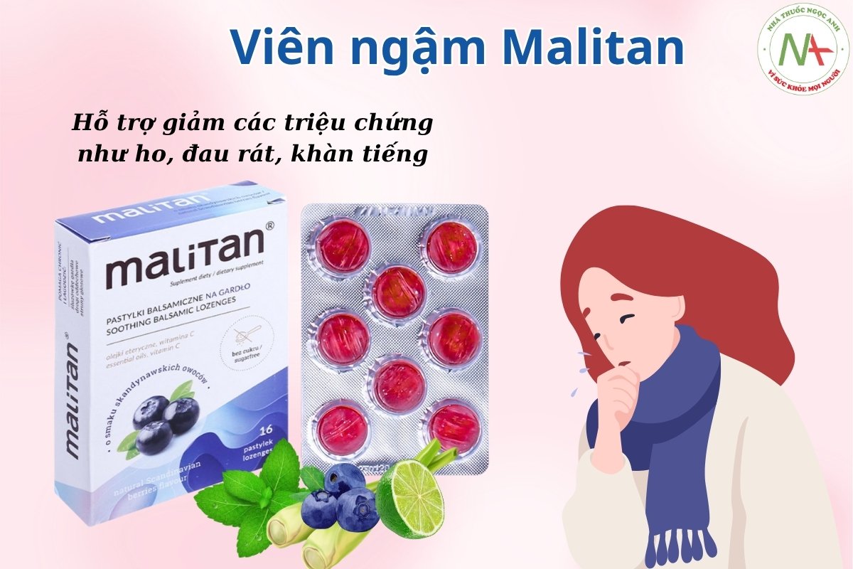 Viên ngậm Malitan là sản phẩm hỗ trợ giúp làm dịu cổ họng, cải thiện tình trạng ho và đau rát do kích ứng.
