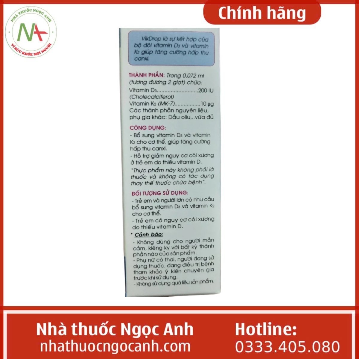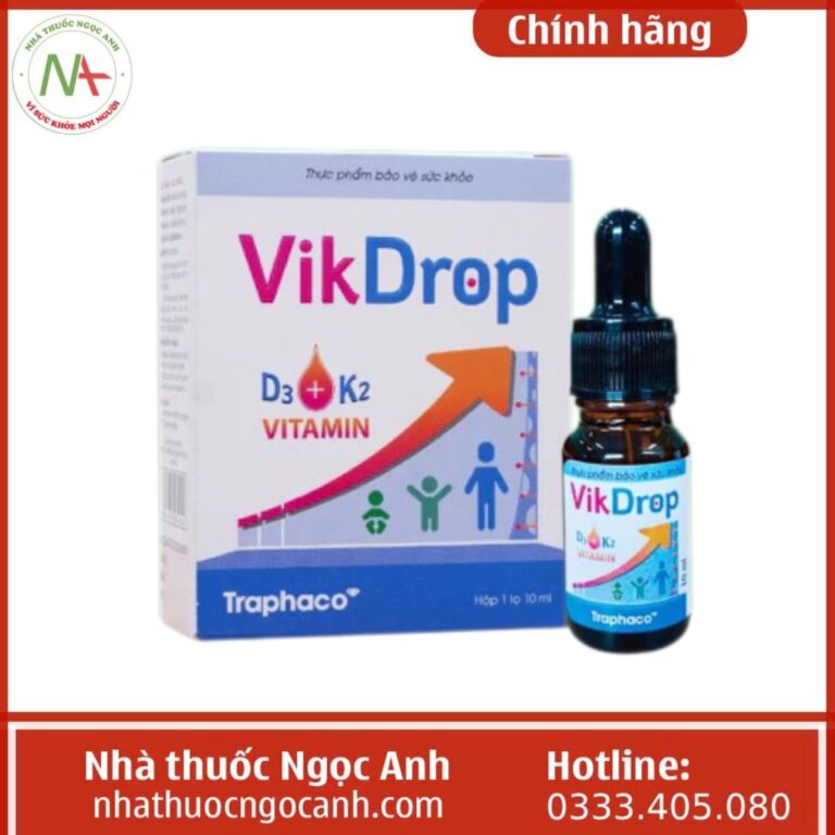Sản phẩm VikDrop có tác dụng bổ sung vitamin D3 và K2 cho cơ thể, từ đó giúp tăng cường khả năng hấp thu canxi. Ngoài ra, sản phẩm còn hỗ trợ giảm nguy cơ còi xương ở trẻ em do thiếu vitamin D.