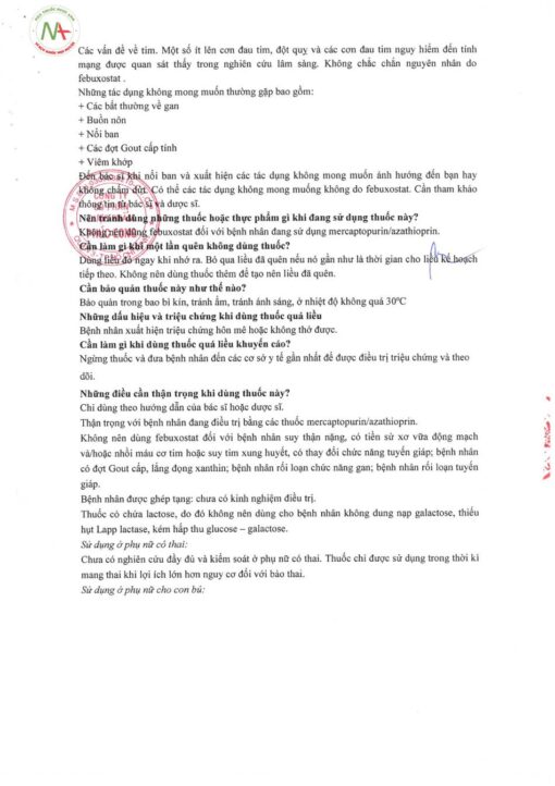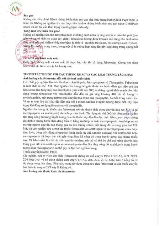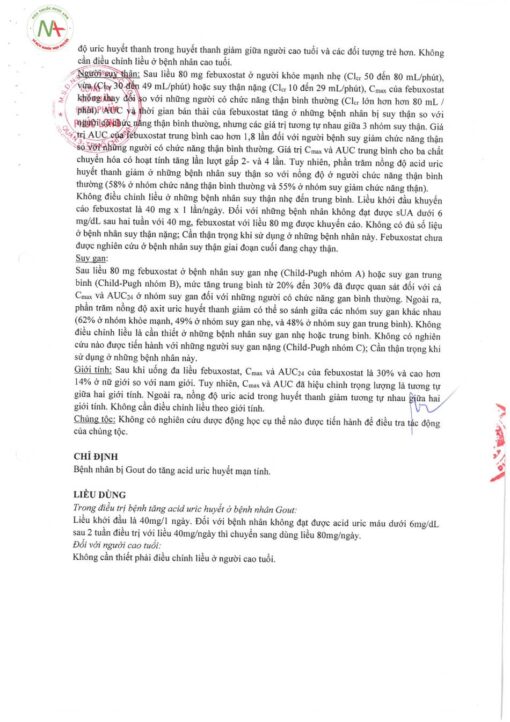 - Theo dõi bệnh nhân có các dấu hiệu và triệu chứng của nhồi máu cơ tim và đột quỵ, và tổn thương gan, bệnh nhân có chức năng thận suy giảm dường như dung nạp tốt febuxostat, và không cần điều chỉnh liều. Febuxostat thực sự có thể làm chậm sự tiến triển của bệnh thận mãn tính nhẹ hoặc trung bình.