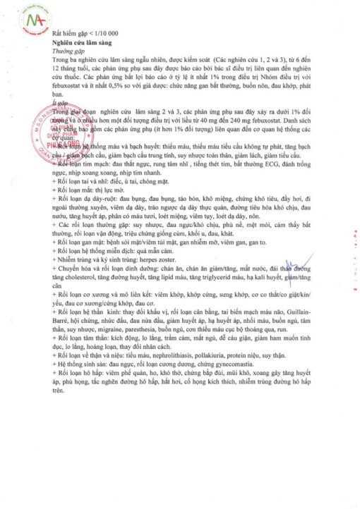 Theo nghiên cứu của nhóm tác giả Michael A Becker, H Ralph Schumacher, Patricia Một MacDonald,Eric Lloyd, Christopher Lademacher về chủ đề: “Hiệu quả lâm sàng và độ an toàn của việc hạ urate lâu dài thành công bằng febuxostat hoặc allopurinol ở những đối tượng bị bệnh gút” như sau: