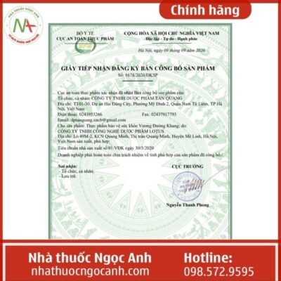 Nhà sản xuất: Công Ty TNHH Công Nghệ Dược Phẩm Lotus. Địa chỉ tại Lô 49M-2, KCN Quang Minh, Thị trấn Chi Đông, Huyện Mê Linh, Hà Nội.