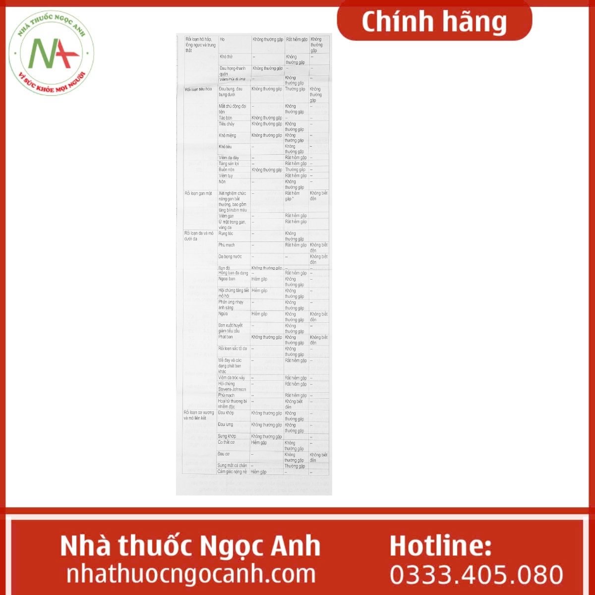- Không rõ tần suất: Giảm hemoglobin, giảm hematocrit, giảm bạch cầu, giảm tiểu cầu, tăng kali máu, suy thận, tăng creatinine huyết thanh, phù mạch, viêm mạch, đau cơ, tăng chức năng gan, bệnh huyết thanh.