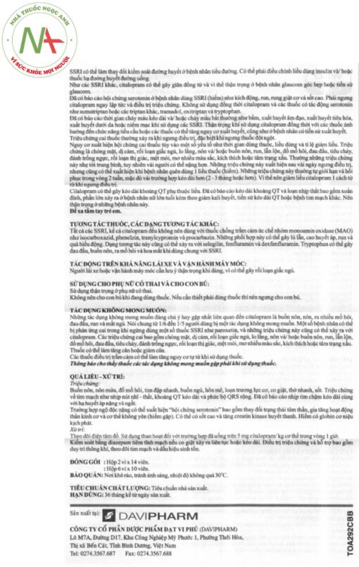 - Thành phần chính là Citalopram với tác dụng điều trị trầm cảm, rối loạn lưỡng cực và rối loạn ám ảnh cưỡng bức.