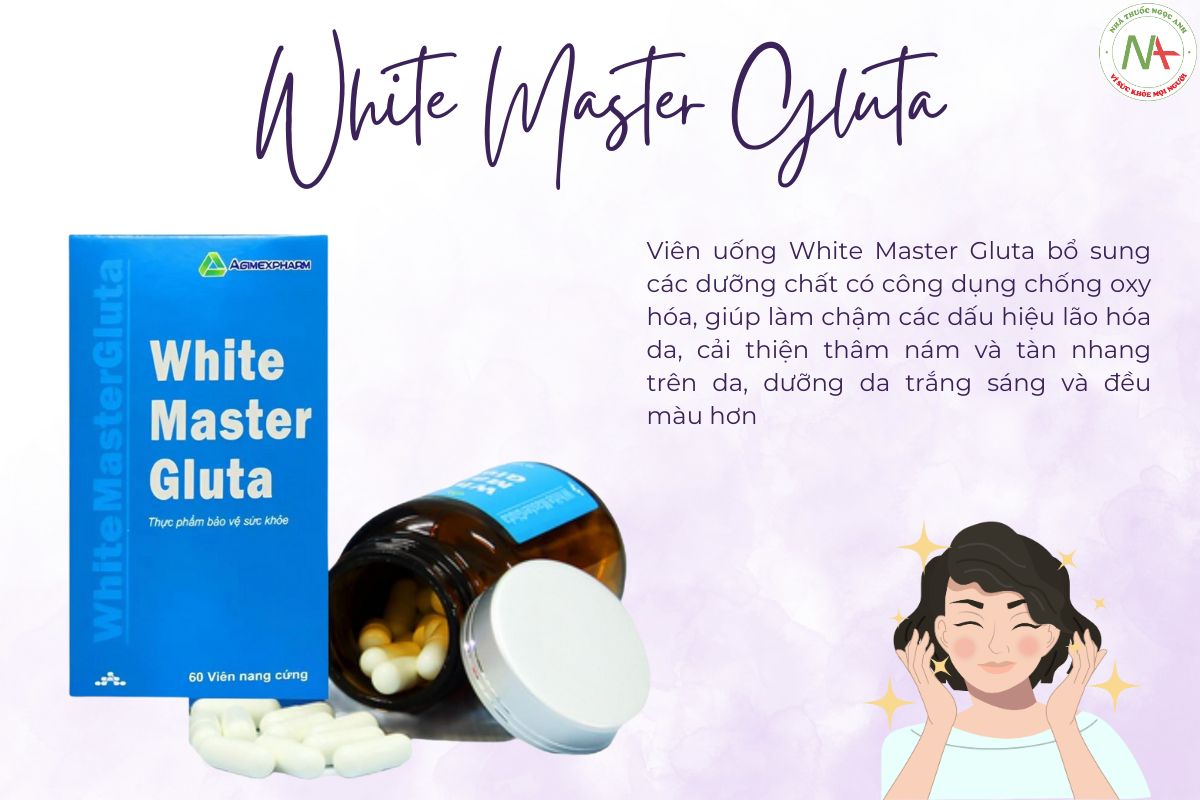 Viên uống White Master Gluta bổ sung các dưỡng chất có công dụng chống oxy hóa, giúp làm chậm các dấu hiệu lão hóa da, cải thiện thâm nám và tàn nhang trên da, dưỡng da trắng sáng và đều màu hơn.