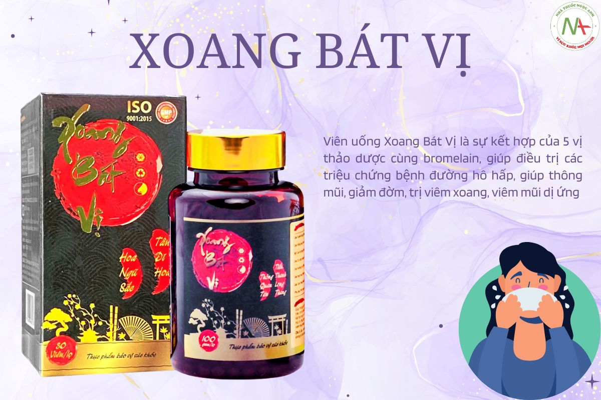 Viên uống Xoang Bát Vị là sự kết hợp của 5 vị thảo dược cùng bromelain, giúp điều trị các triệu chứng bệnh đường hô hấp, giúp thông mũi, giảm đờm, trị viêm xoang, viêm mũi dị ứng.